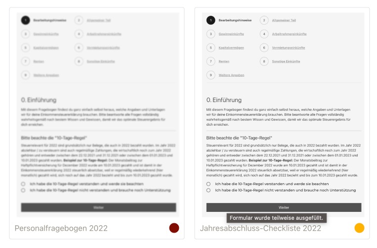 Das Ausnutzen von Steuervorteilen kann eine Herausforderung sein, wenn man nicht über das notwendige Fachwissen verfügt. Unser Portal bereichert die Checklisten mit gezielten steuerlichen Hinweisen, die dazu konzipiert sind, Sie bei der optimalen Nutzung möglicher Steuervorteile zu unterstützen. Diese Ratschläge können dazu beitragen, Ihre Steuerlast zu minimieren und Ihre finanzielle Situation zu verbessern.